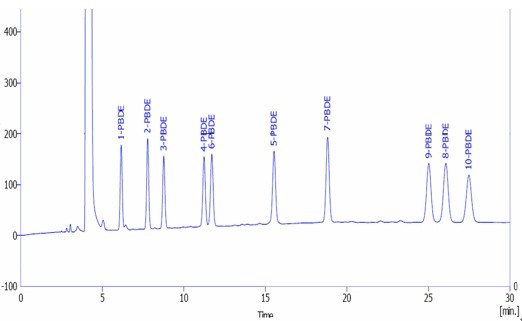 10種多溴聯(lián)苯醚標(biāo)準(zhǔn)混合溶液譜圖: