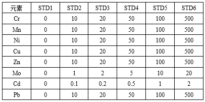利用逐級稀釋法,采用1%硝酸溶液,按表2配制各待測元素標準溶液,且加入Rh元素作為內(nèi)標(最終Rh濃度20μg/L)。
