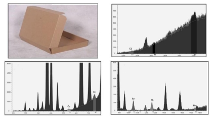 參考標(biāo)準(zhǔn)GB/T 15337-2008,采用AAS9000搭配HG600S型氫化物發(fā)生系統(tǒng),對(duì)快遞包裝紙箱中鉛、鎘、鉻、汞等十幾種元素進(jìn)行加標(biāo)回收測(cè)試,各元素不同測(cè)試方法的檢出限、精密度、回收率均滿足標(biāo)準(zhǔn)檢測(cè)要求。3、EDX對(duì)快遞包裝重金屬元素的初步篩選分析