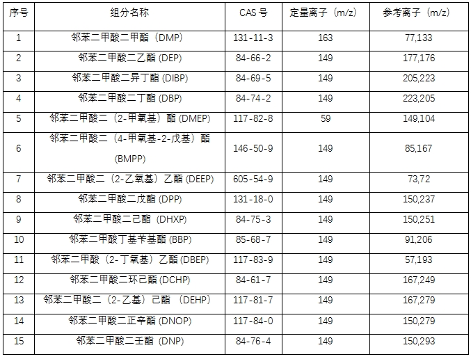 參照現(xiàn)行相關(guān)標(biāo)準(zhǔn):GB 5009.271—2016《食品安全國家標(biāo)準(zhǔn) 食品中鄰苯二甲酸酯的測定》、GB 9685-2016《食品 安全國家標(biāo)準(zhǔn) 食品接觸材料及制品用添加劑使用標(biāo)準(zhǔn)》、LS/T 6131-2018《糧油檢驗(yàn) 植物油中鄰苯二甲酸酯類化合物的測定》,本方法對食用油中的15種鄰苯二甲酸酯類物質(zhì)進(jìn)行檢測,樣品經(jīng)有機(jī)溶劑提取、凈化、定容后,用GC-MS 6800氣相色譜質(zhì)譜聯(lián)用儀進(jìn)行準(zhǔn)確的定性和定量測定。