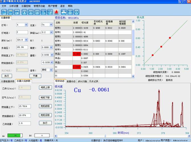 樣品測試:于原子吸收光譜儀波長324.7nm處,使用空氣-乙炔火焰,以水調(diào)零,測量試液的吸光度,減去隨同試料的空白試驗(yàn)溶液的吸光度,從工作曲線上查出相應(yīng)的銅濃度