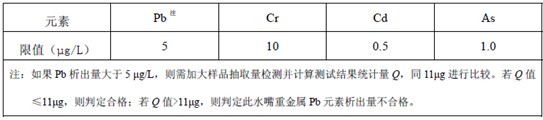 (3)HJ/T 411-2007《環(huán)境標(biāo)志產(chǎn)品技術(shù)要求 水嘴》主要對(duì)鎘、鉛、鉻、砷四種重金屬元素的析出量予以限定,限定要求如表3所示: