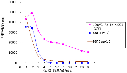 儀器首先在標(biāo)準(zhǔn)模式下進行參數(shù)優(yōu)化(利用10μg·L-1的Li、Co、In、U、Ce調(diào)諧液對儀器工作參數(shù)進行調(diào)節(jié),使儀器靈敏度高,同時氧化物及雙電荷產(chǎn)率小于3%);再開啟He/H2碰撞反應(yīng)氣,逐步增大He/H2流量,測試超純水、4%HCl及10μg·L-1 As(4%HCl介質(zhì))在75amu處的響應(yīng)信號,計算其背景等效濃度(詳細數(shù)據(jù)見表1及圖1);并利用As標(biāo)液進一步優(yōu)化He/H2流量,得到儀器工作參數(shù)如表2所示。